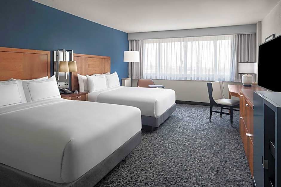 This room features a flat-screen TV with cable channels, a seating area, and a work desk.
